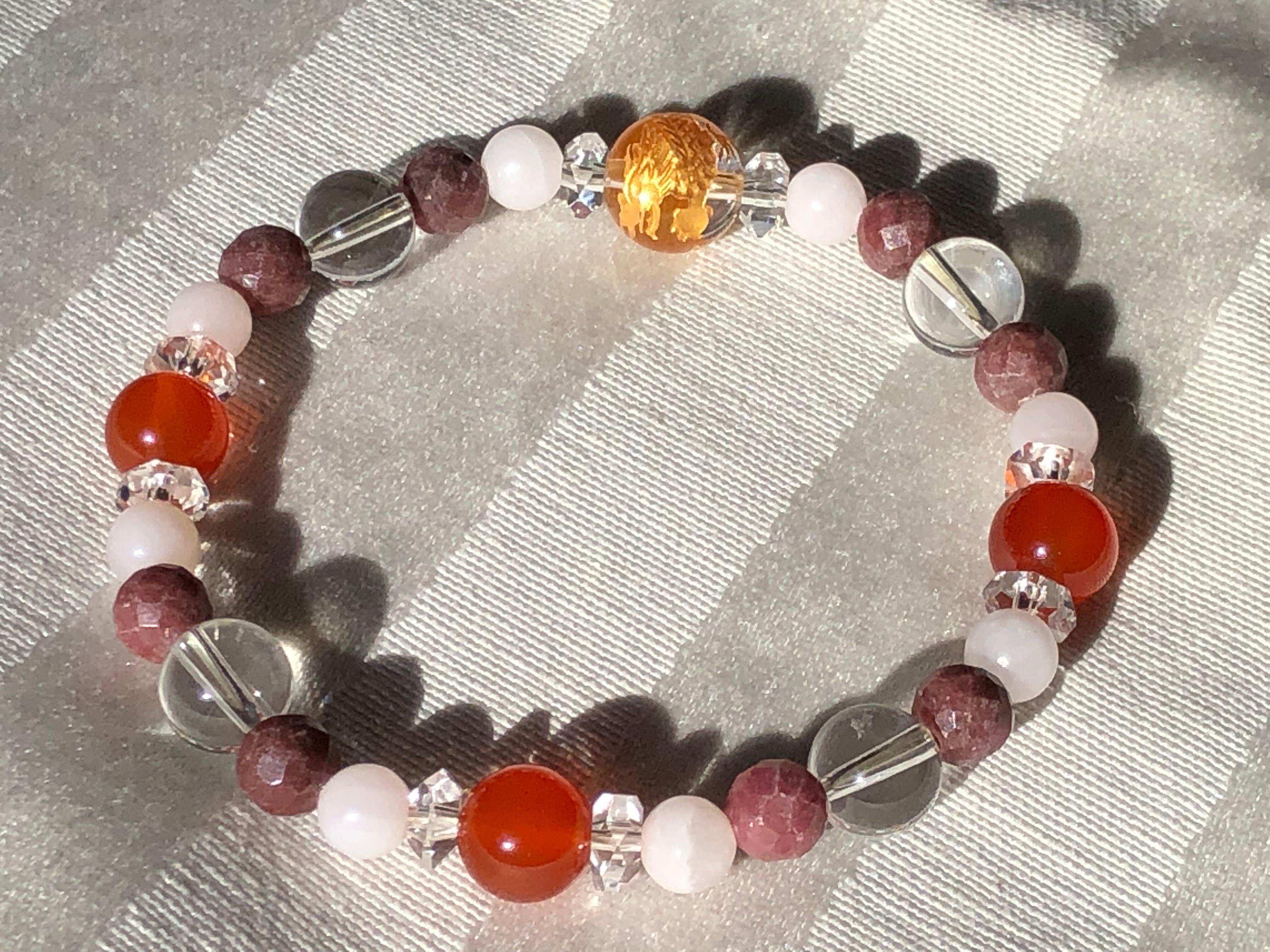 使用天然石:龍神水晶10mm、カーネリアン8mm、ピンクマンガンカルサイト6mm、ロードナイト6mm、水晶8mm、ボタン水晶