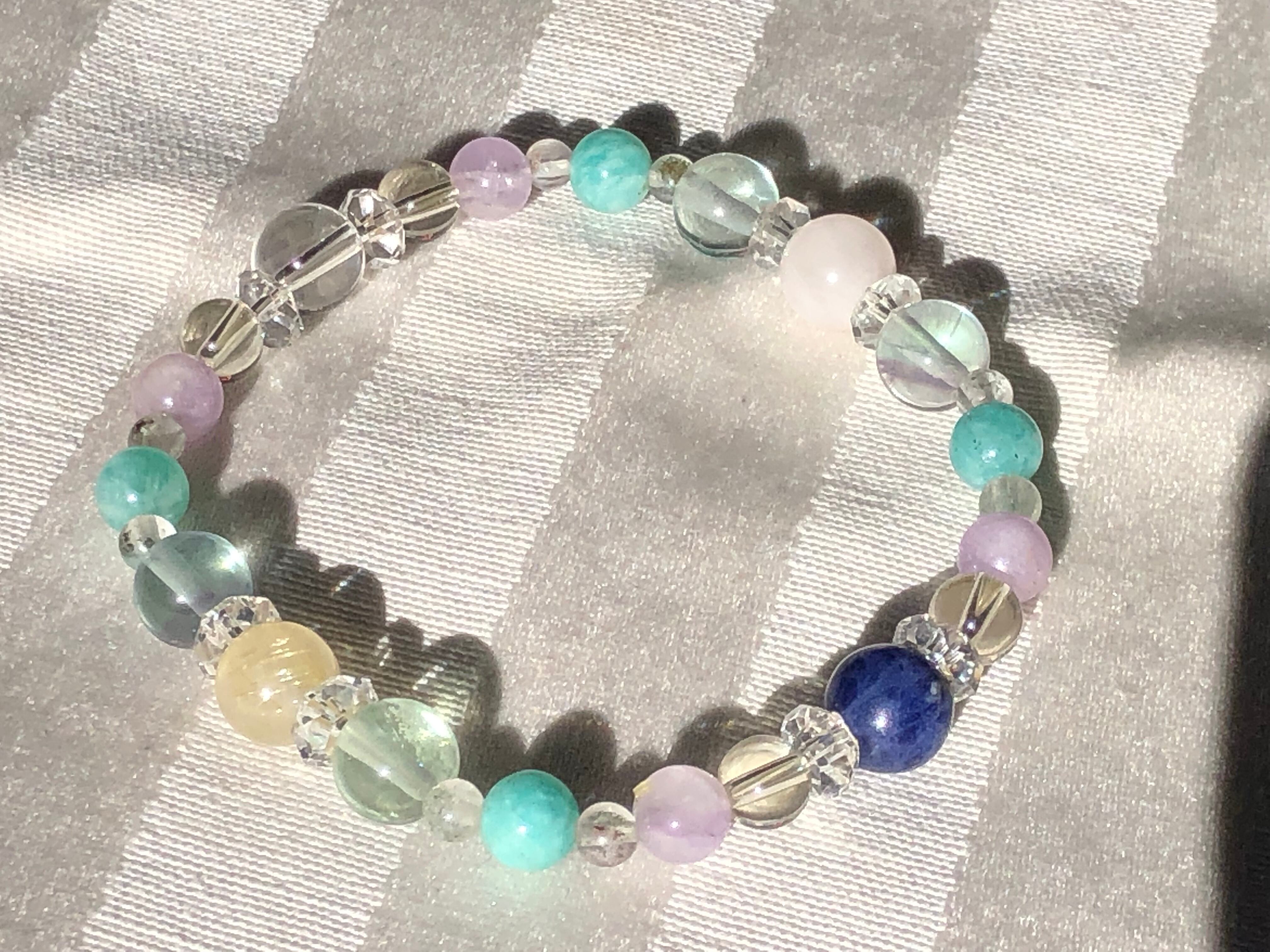 使用天然石:ローズクォーツ8mm、ソーダライト8mm、ルチルクォーツ8mm、フローライト8mm、ラベンダーアメジスト6mm、ロシアンアマゾナイト6mm、ガーデンクォーツ3mm、シトリン6mm、水晶8mm、ボタン水晶