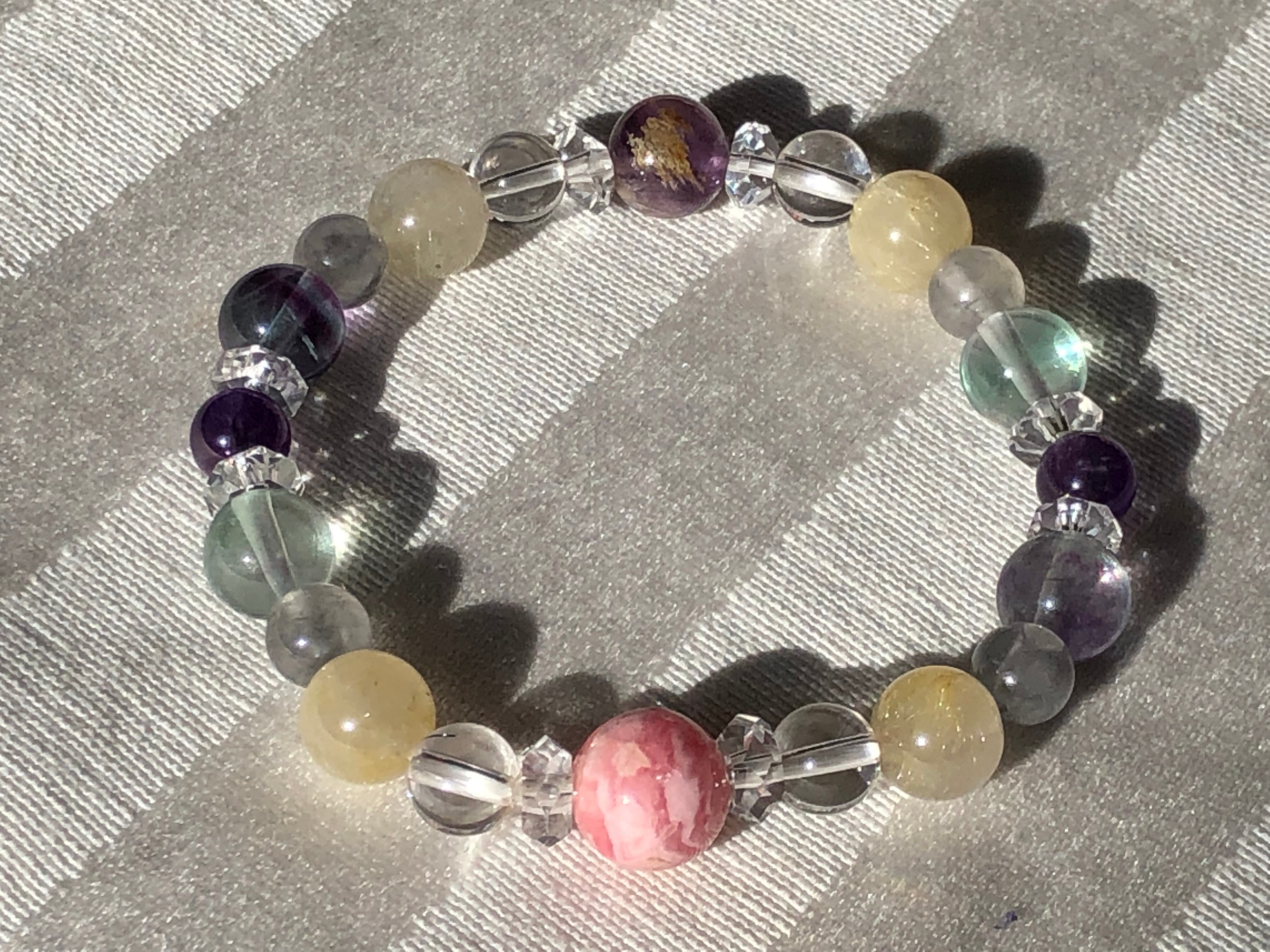 使用天然石:インカローズAA9mm、オニファライト(エンジェルウィングアメジスト)8mm、フローライト8mm、ルチルクォーツ8mm、アメジスト6mm、クラウディアクォーツ6mm、水晶6mm、ボタン水晶